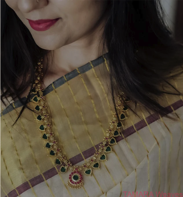 Gold replica Palakka Long Haram Necklace with Pendant green colour