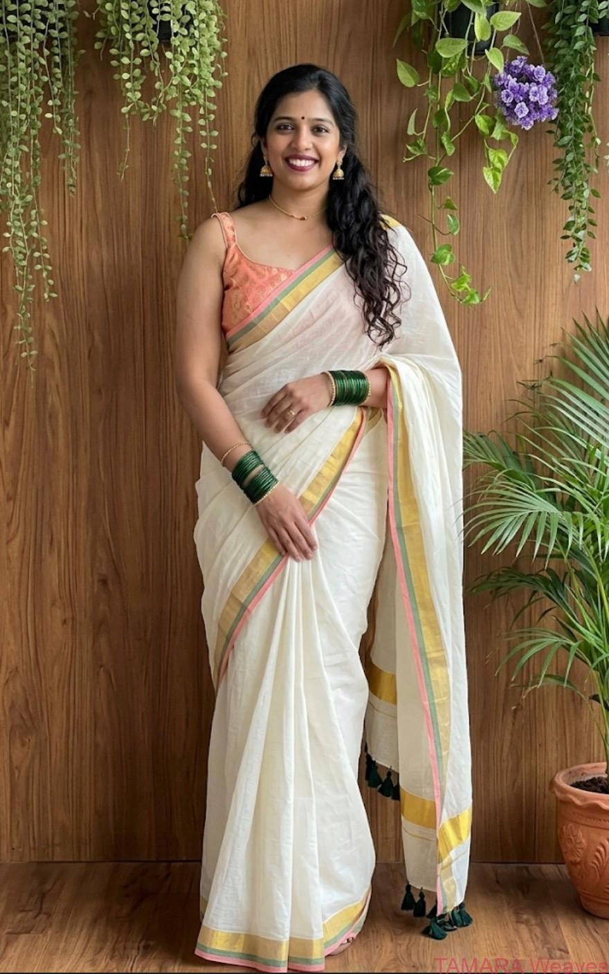 A very light, subtle colour – peach with a thin green kara and zari – making this saree classy with a unique vibe. Pair it with a golden sleeveless blouse and green jewellery to stand out for your next event here in Australia.