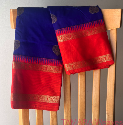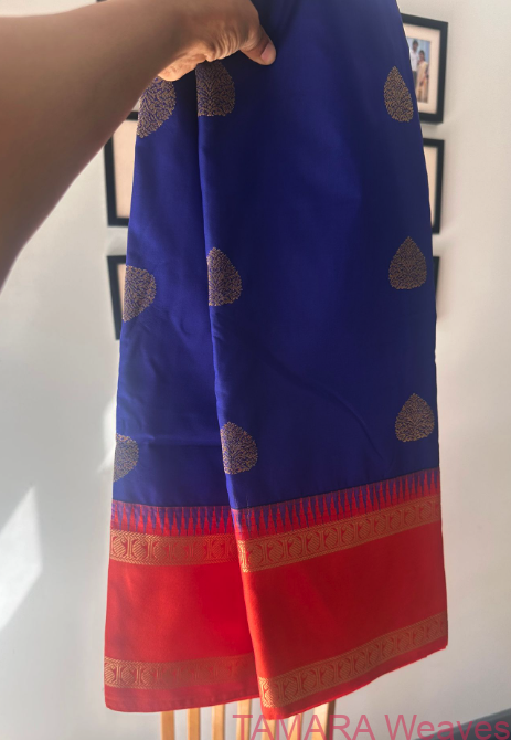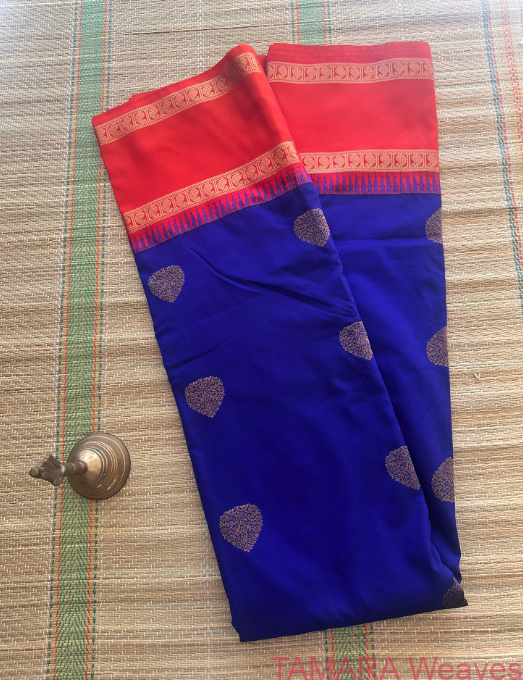 Royal blue and sunset orange, and antique zari saree with woven buttas, temple gap border.