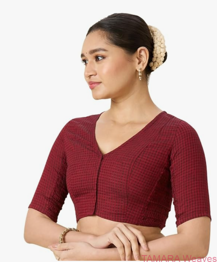 This is a ready to wear elastic stretchable blouse in madras checks pure cotton fabric and deep maroon shade. Comes with smoked sleeve sides and smoked sides in the chest area that makes the blouse stretchable.