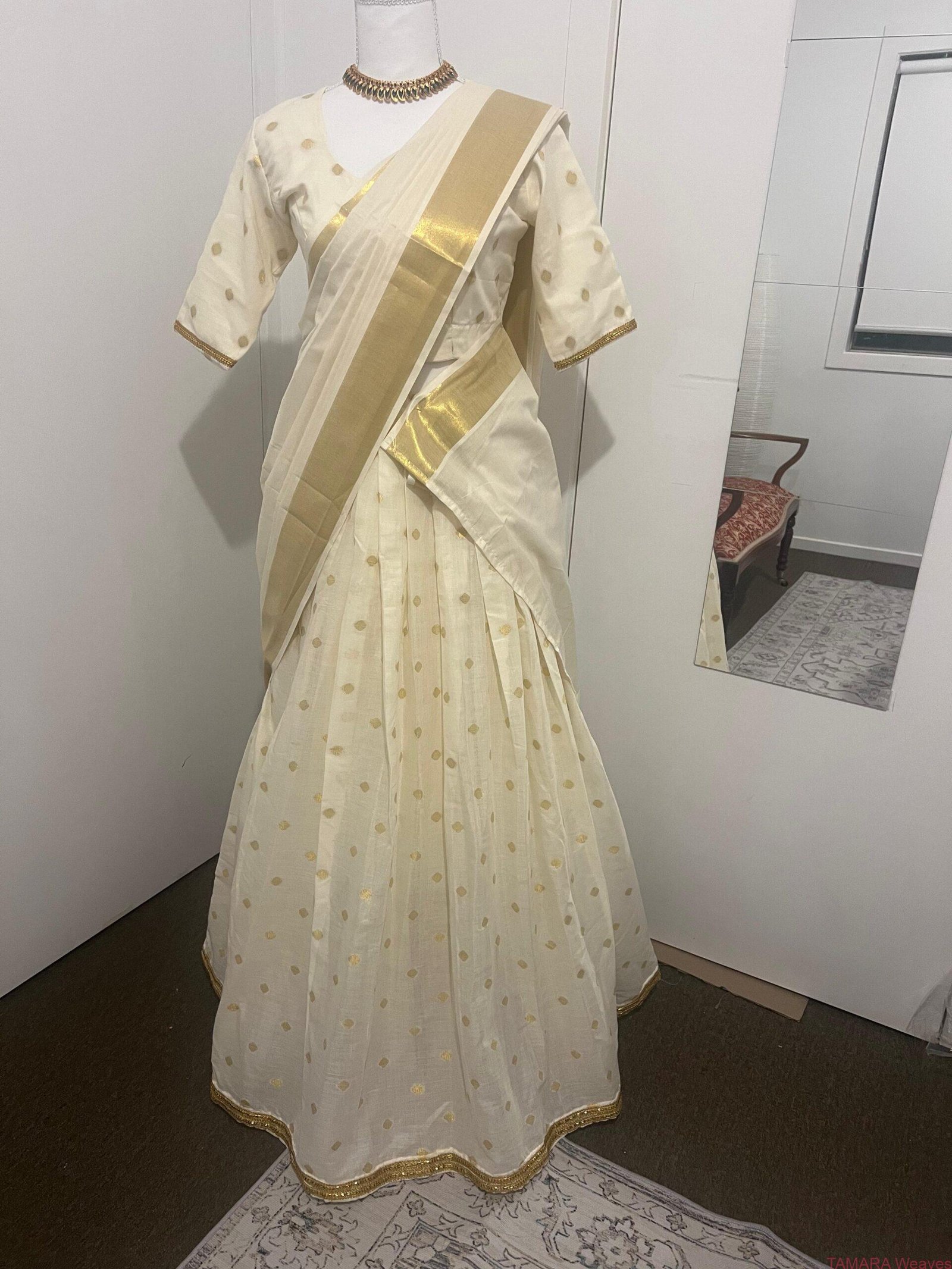 Tamara Lehenga – Pottu dhawani set (Polka dots) – custom made at Tamara Weaves’ stitching unit.